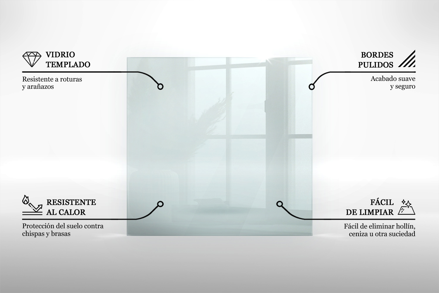 ✅ Fácil mantenimiento: La superficie lisa del vidrio permite una limpieza rápida y sencilla de cenizas o polvo.